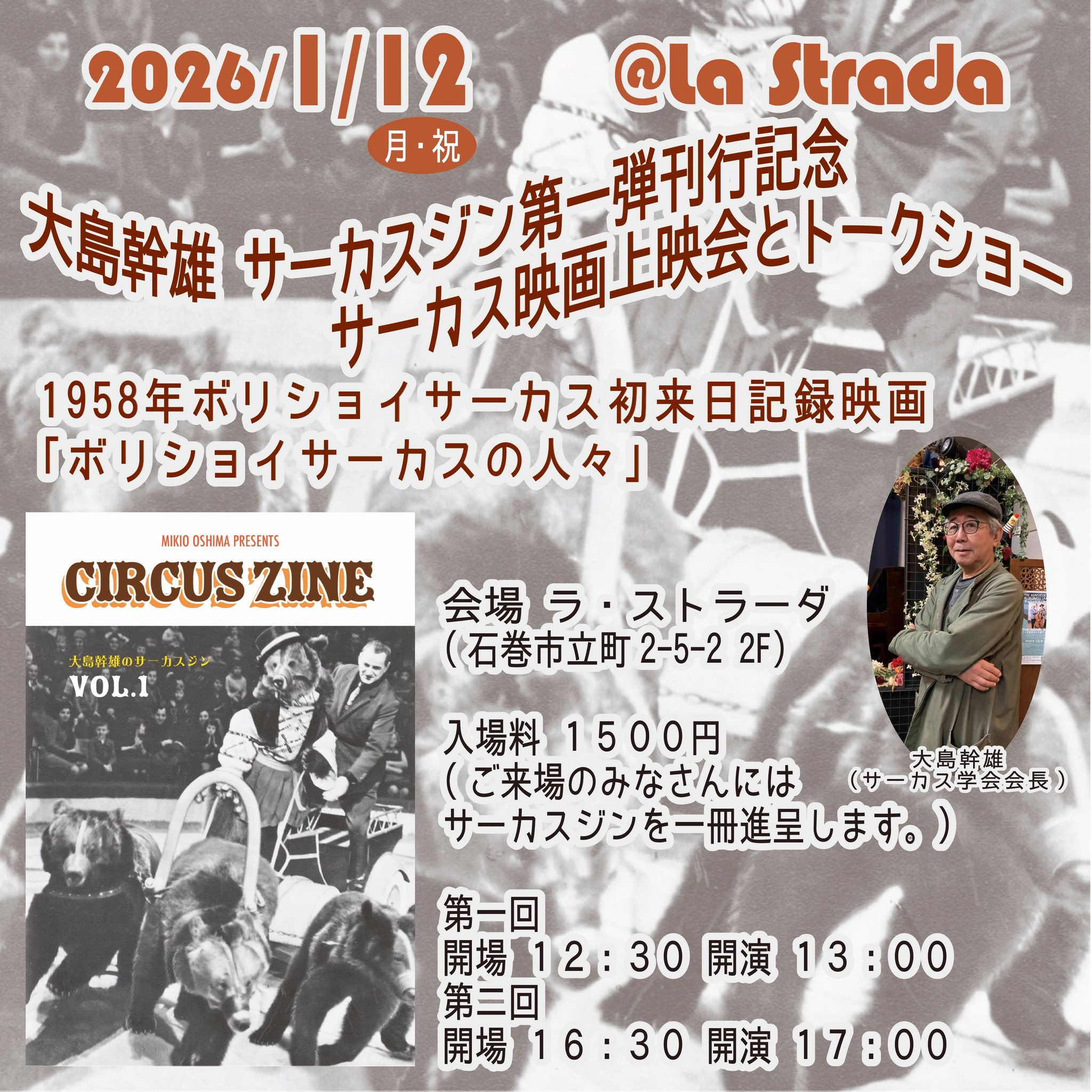 > 2022.5.24 | 【日程変更のお知らせ】 映像で見るサーカス世界漫遊記 第四回「中央アジアのサーカス編」は開催日を6月12日(日)から 6月19日(日)に変更します。 時間、料金などの変更はありません。 |