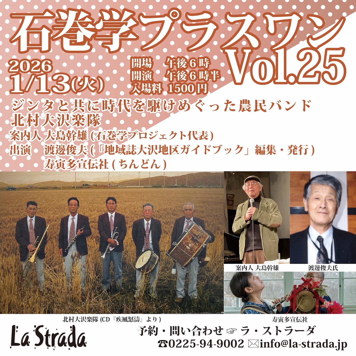 | > 2025.12.10 | 2026年1月の SCHEDULE を更新しました。 2026/1/13(火) 石巻学プラスワン Vol.25 ジンタと共に時代を駆けめぐった農民バンド 北村大沢楽隊 |